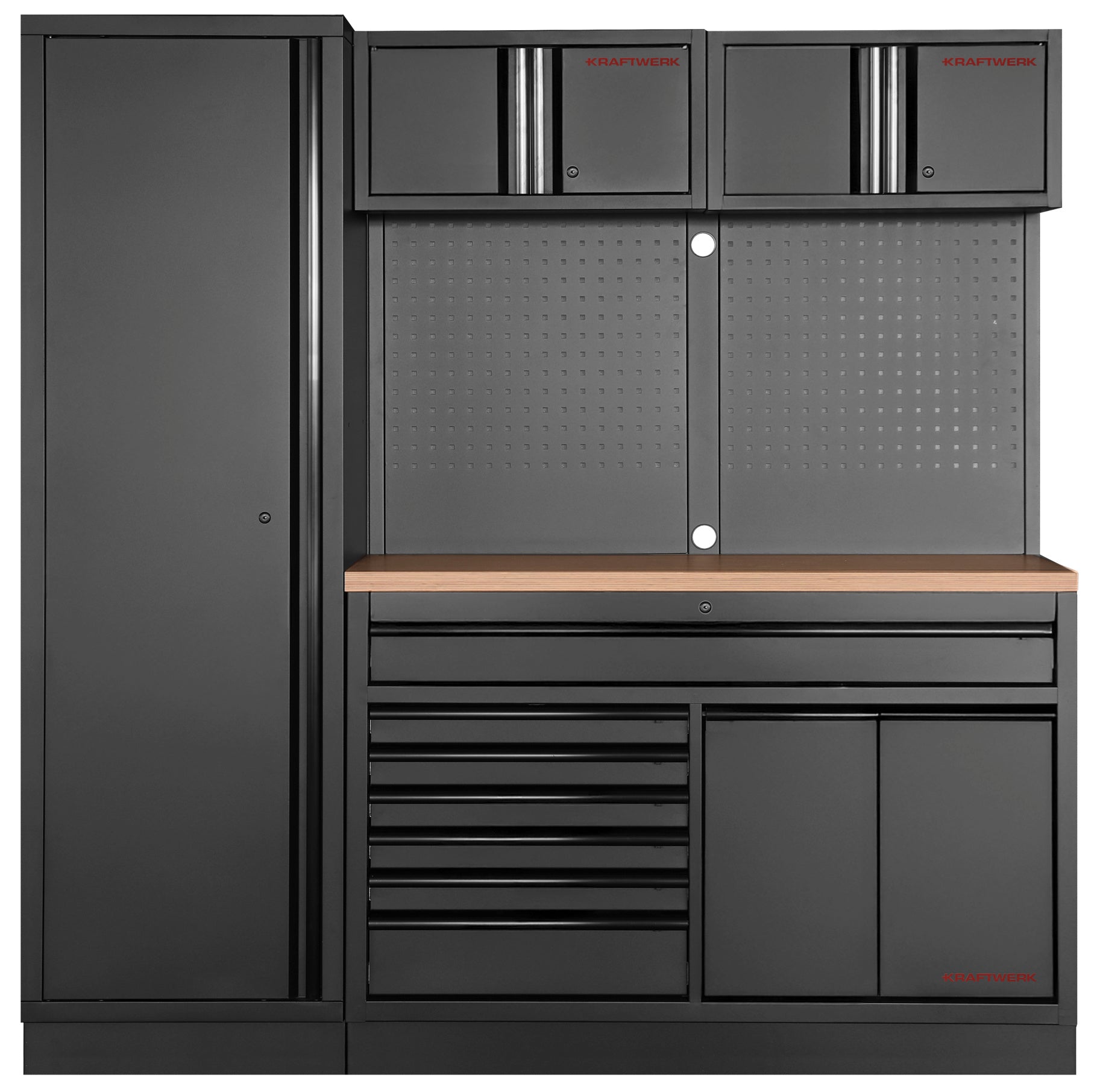 Mit der KRAFTWERK MOBILIO BLACK 4er Unterschrank-Kombination bekommst du eine durchdachte und flexible Aufbewahrungslösung für deine Werkstatt. Sie bietet dir insgesamt 17 Schubladen, einen geräumigen Schrank und eine robuste Arbeitsplatte aus Buche Multiplex. Bis auf die Arbeitsplatte sind alle Komponenten in modernem, zeitlosem Schwarz gehalten. Dank der freistehenden Konstruktion kannst du die Kombination flexibel aufstellen, ohne feste Befestigungen – genau so, wie es für dich am besten passt.