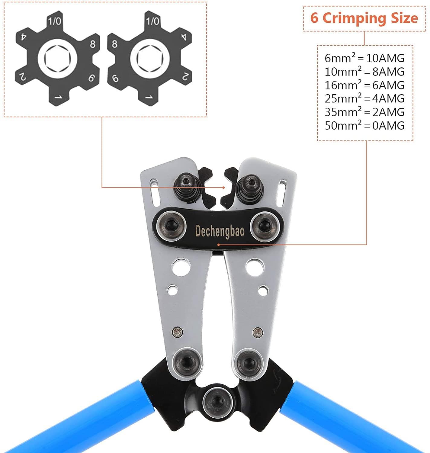 Die Crimpzange hat eine individuelle Einstellung von 6mm²/10mm²16mm²/25mm²/35mm²/50mm² (ähnlich AWG 8/6/4/2/1/1/0).