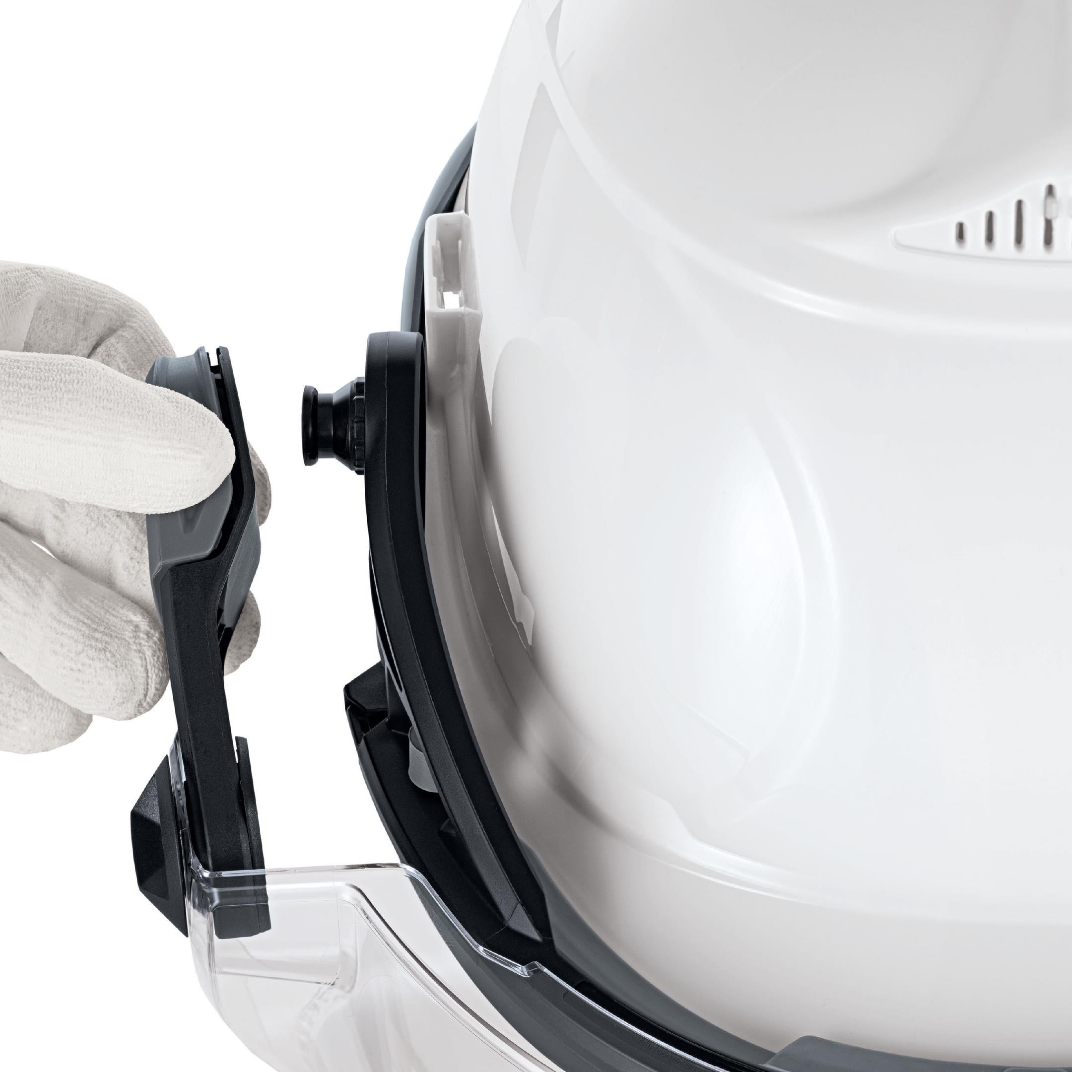 - Stufenlose Arretierung des Visiers über federgetriebene Kinematik, Ruheposition zentral über dem Kopf